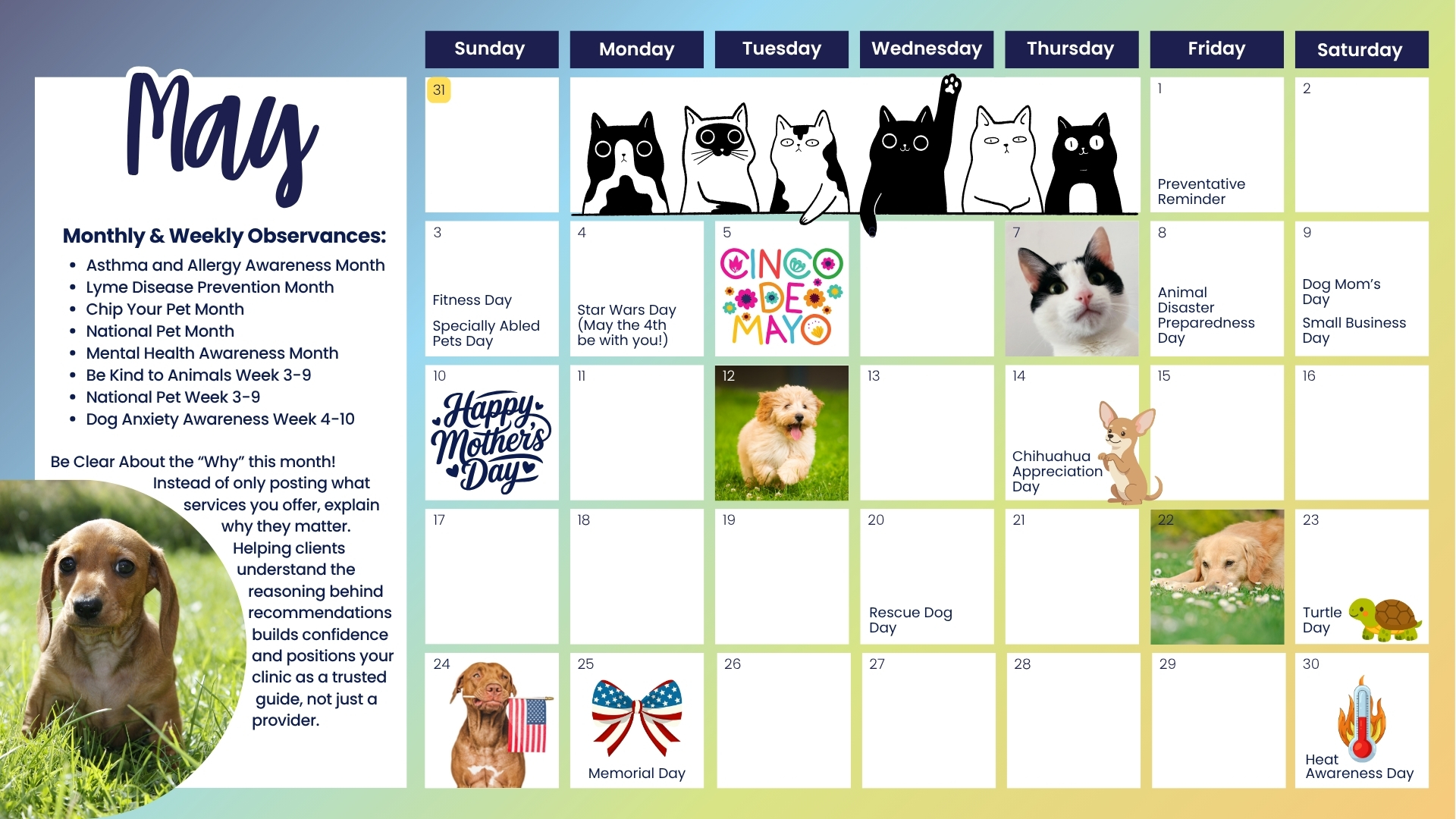 May 9 — National Dog Mom’s Day: Invite your team to share photos of their own pets and encourage followers to do the same. A simple “meet our team’s dogs” post is relatable, low-effort, and builds the kind of personal connection that keeps clients loyal to your practice.